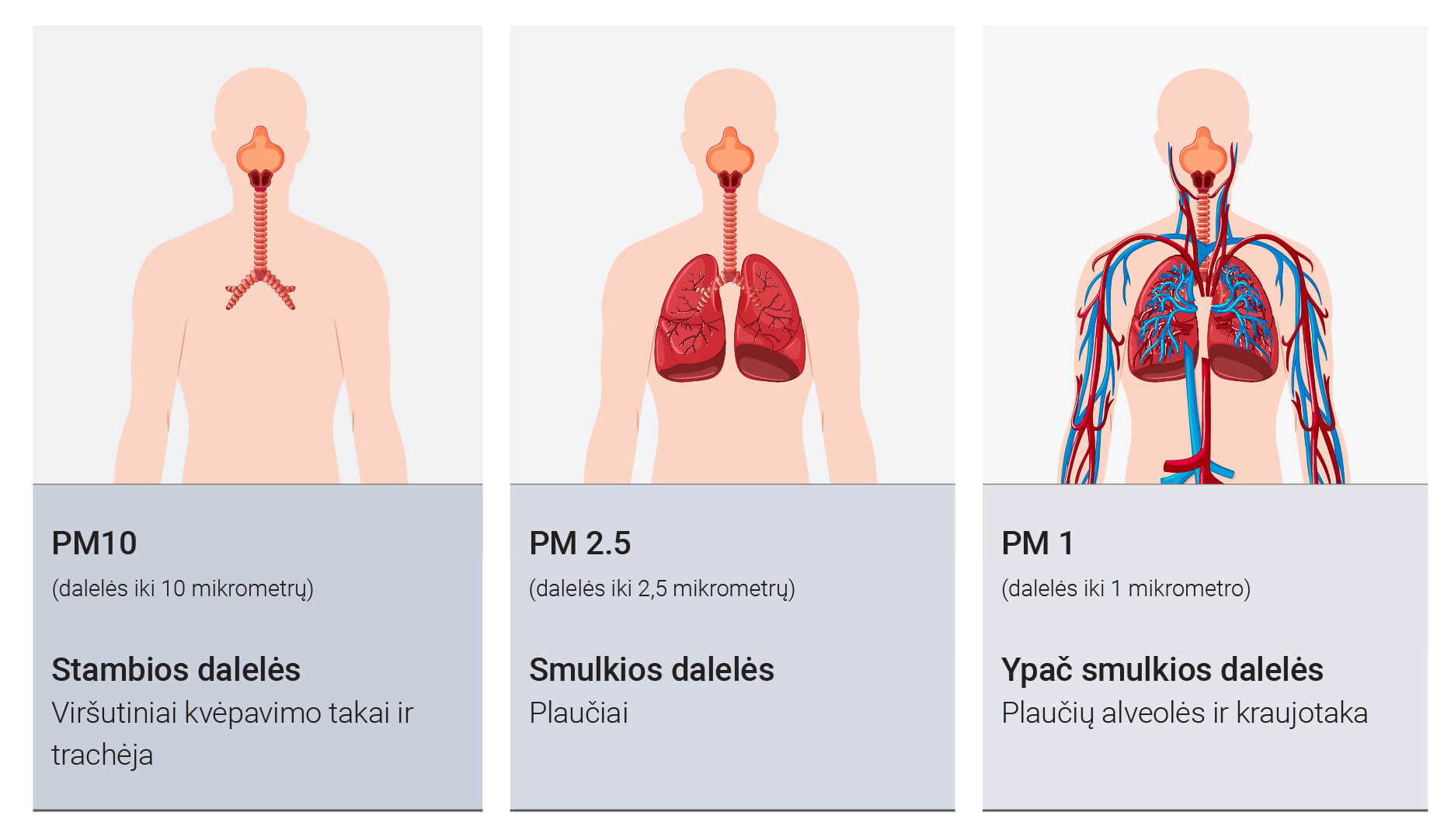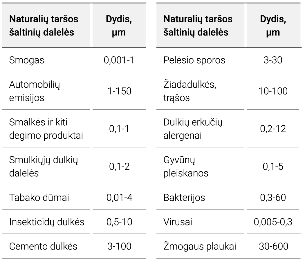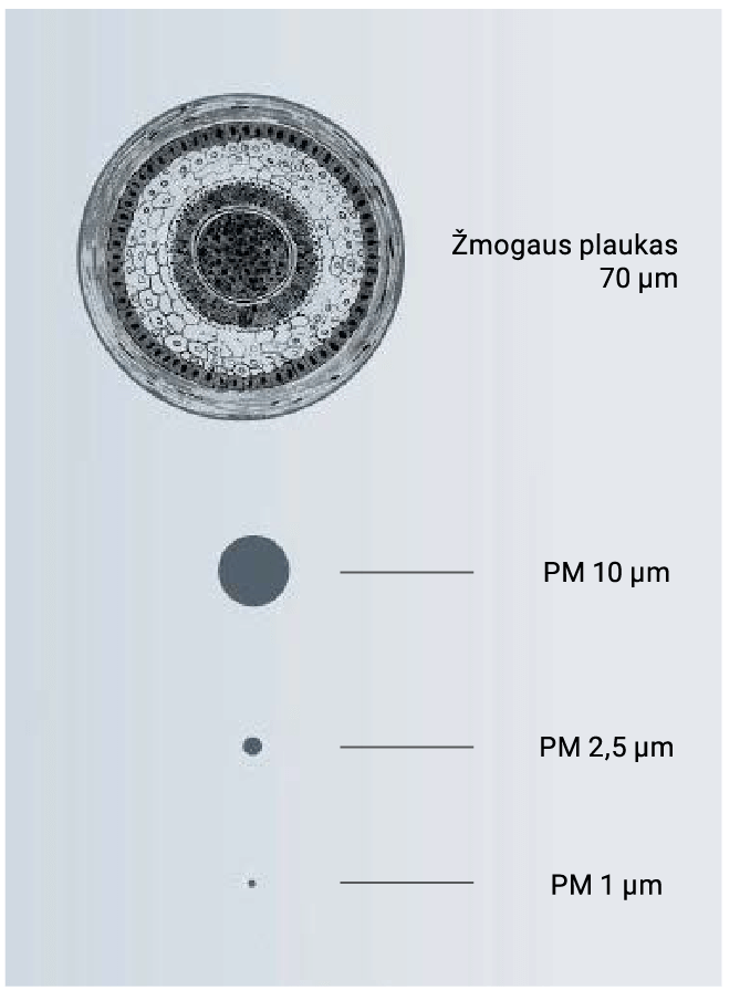 - PM10 (dalelės iki 10 µm) – gali patekti į kvėpavimo takus;