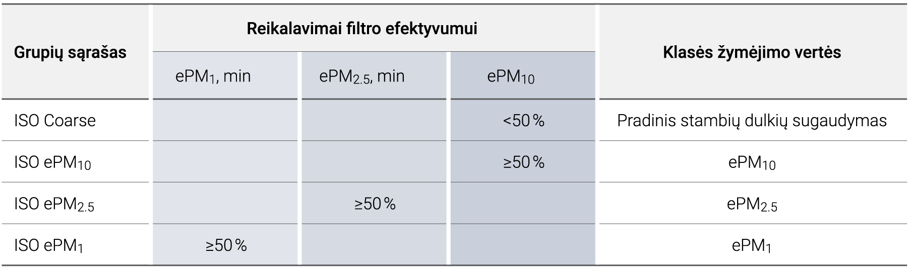 Norint efektyviai apsaugoti patalpų orą, rekomenduojama vėdinimo įrenginiuose naudoti filtrus, atitinkančius ISO 16890 filtravimo standartą: